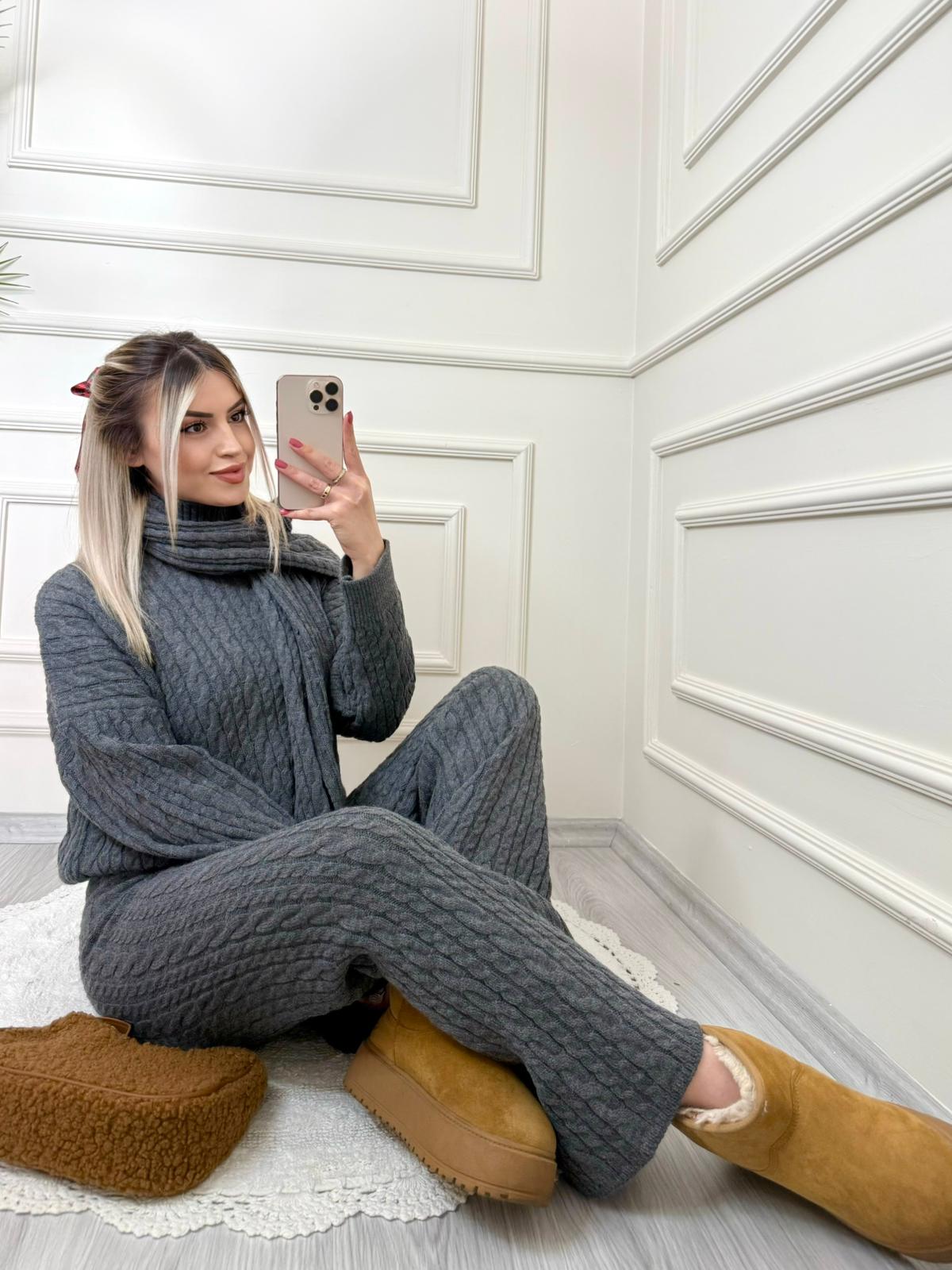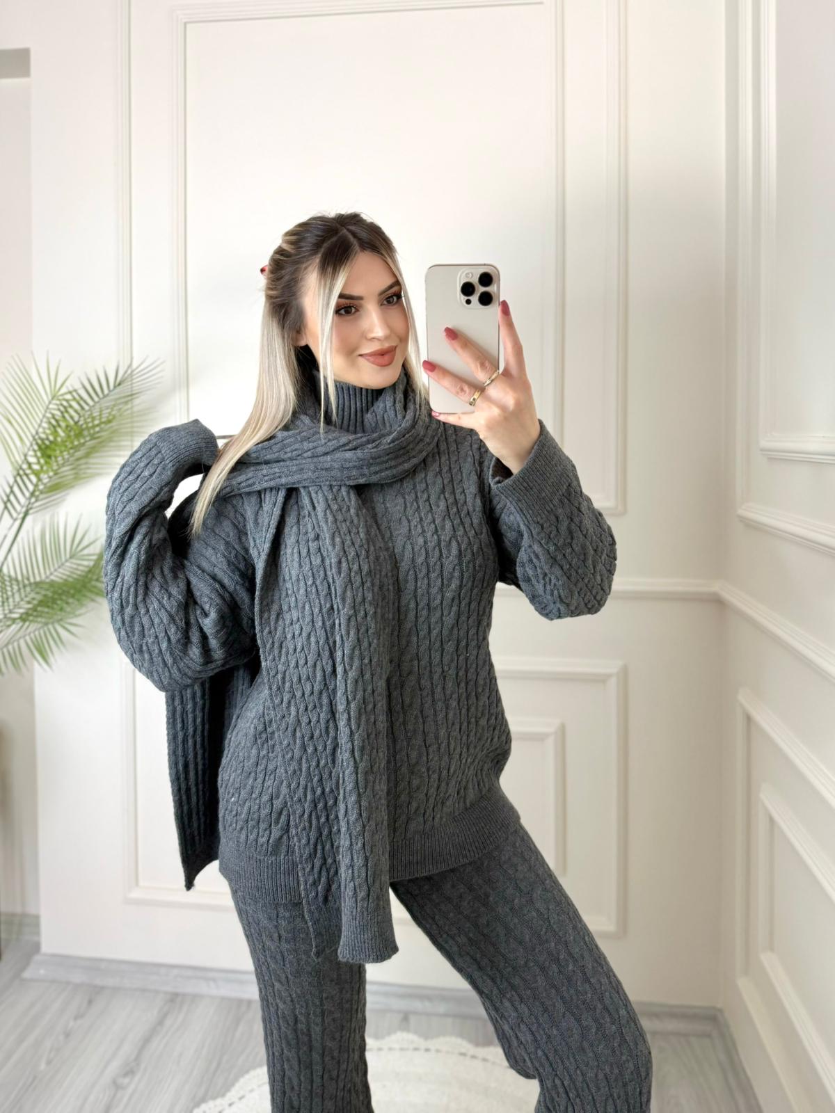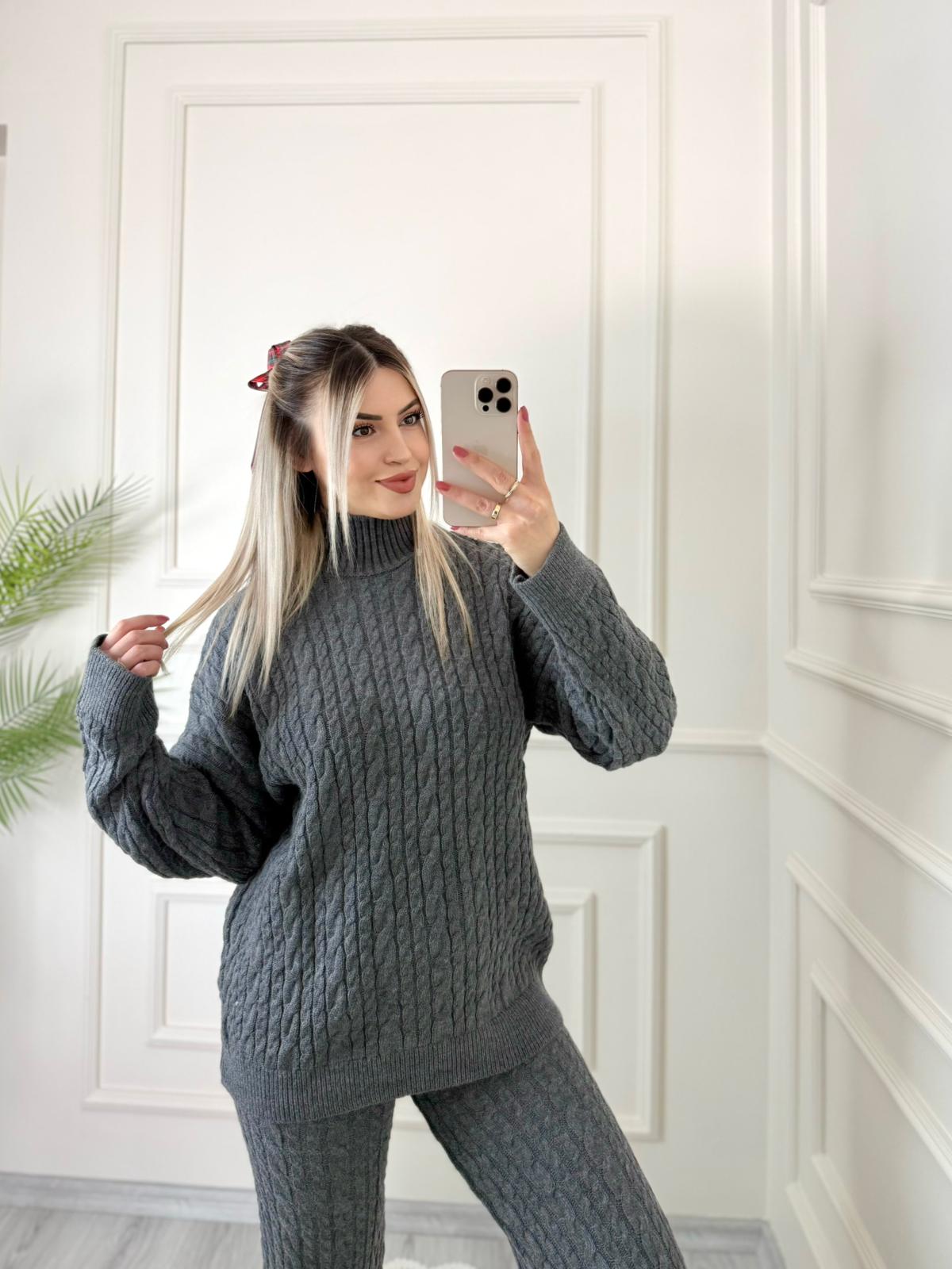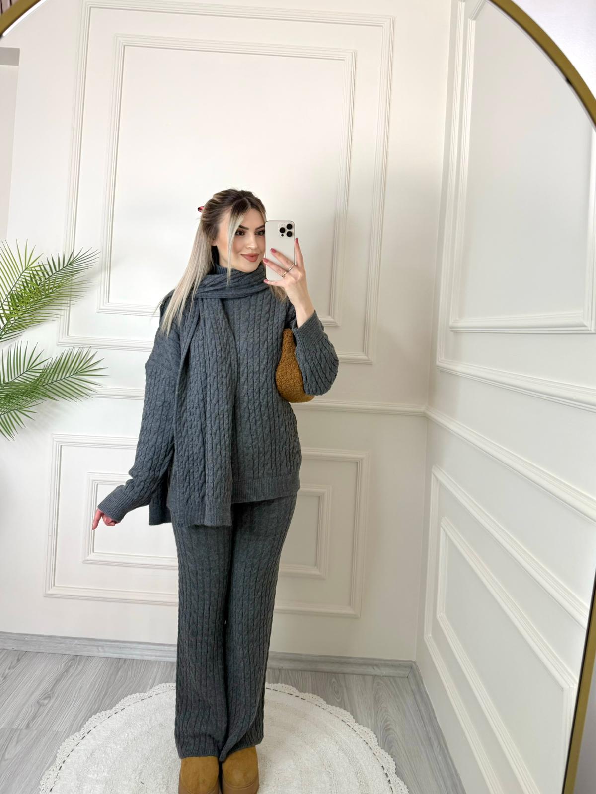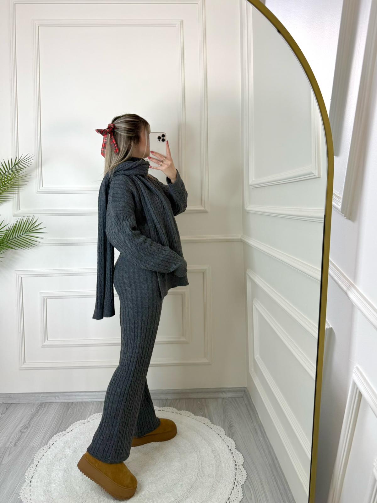 Antrasit Atkılı Saç Örgü Pantolon Kazak Takım