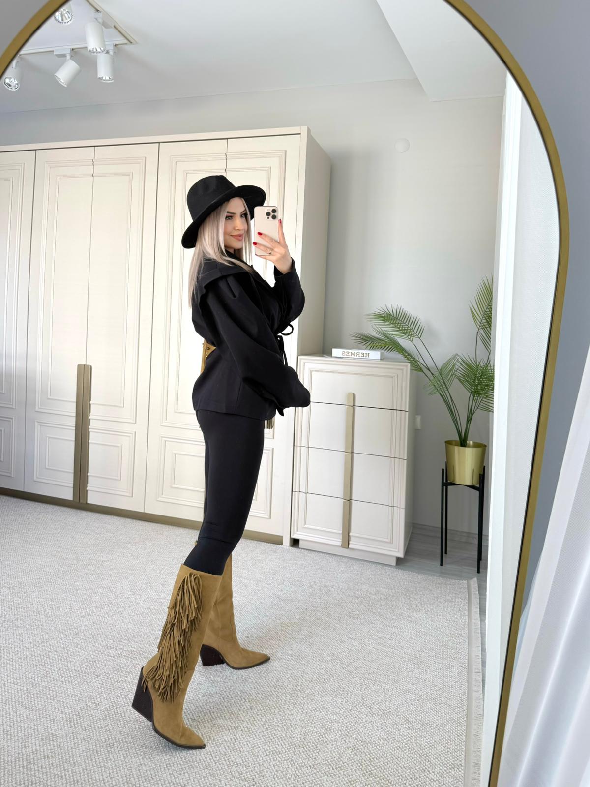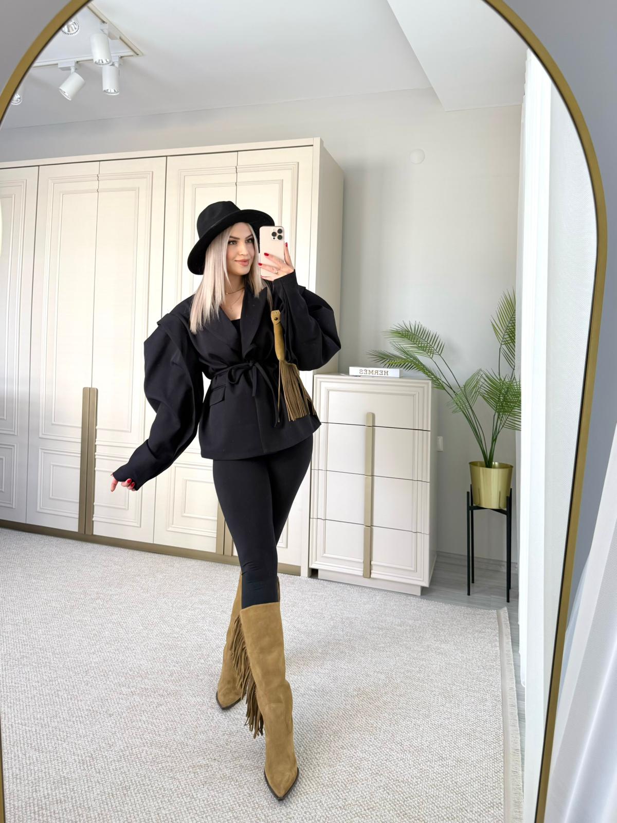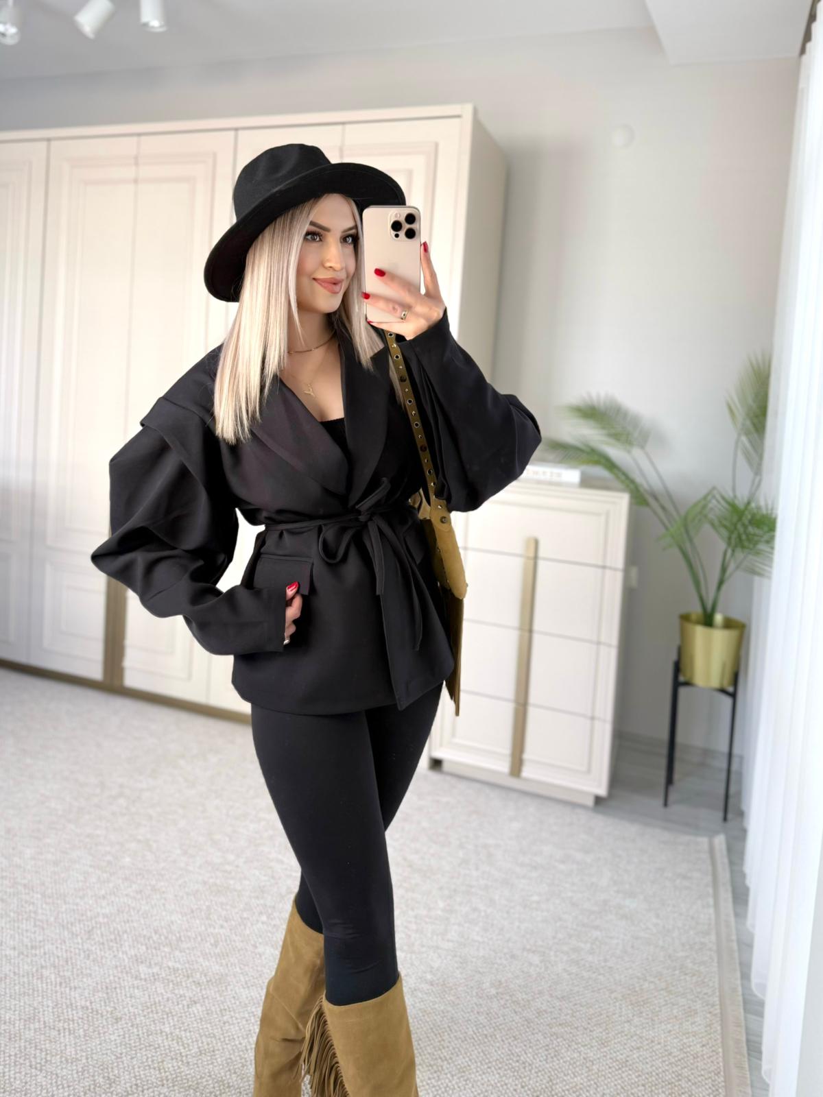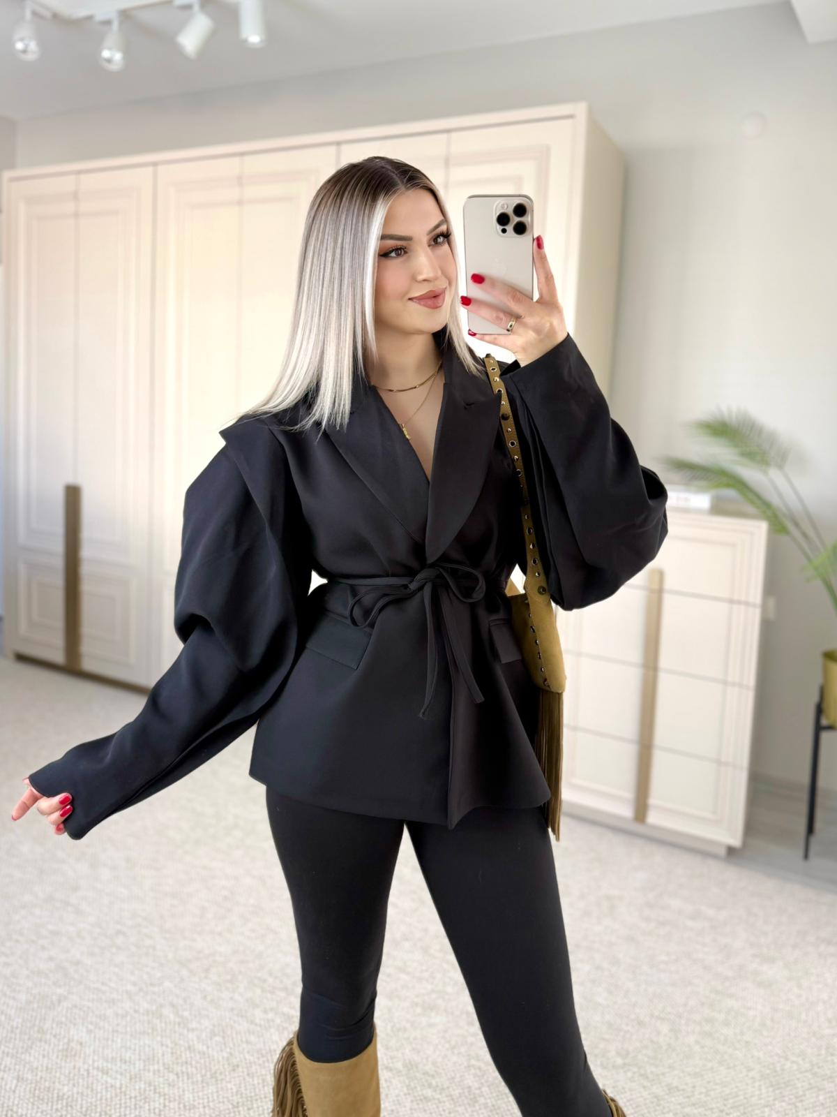 Siyah Maribo Vatkalı Kuşaklı Ceket